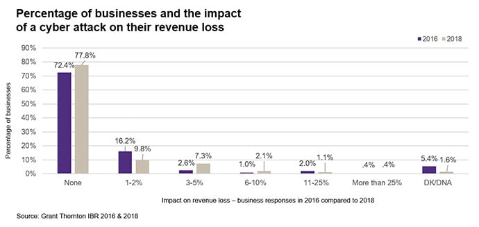 Reassuringly, the number of cyber attacks globally has not increased dramatically in the past year, though we have seen a 6.8% rise since 2015. Impact on revenue also appears stable, with businesses reporting either no loss or only a 1-2% decrease as a result of a cybersecurity breach.