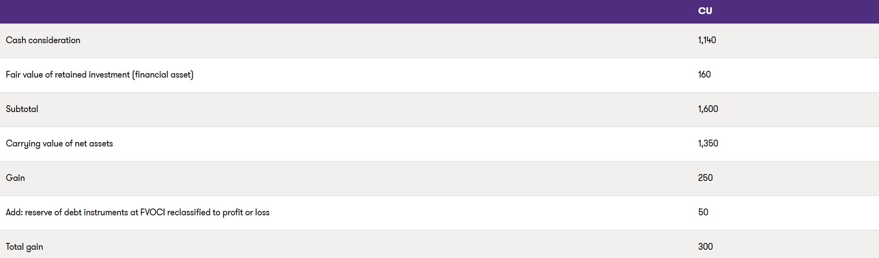 IFRS 10 requires reclassification of any gains or losses previously recognised in OCI (when required by other IFRS) as though the entity had directly disposed of the assets and liabilities. Accordingly, the reserve related to debt instruments held at FVOCI is included in determining the gain on sale of the subsidiary. This represents the gain from original cost to the current FV of the financial asset (CU200 – CU150 = CU50)