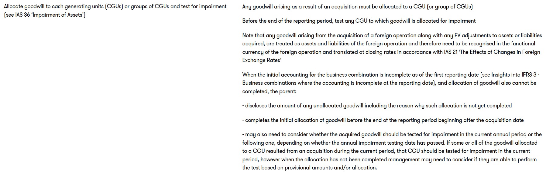 The parent entity is required to undertake a number of practical steps in order to prepare financial statements that include the acquired subsidiary (both for the first post-combination reporting date and subsequently). The following table highlights some key accounting policy and procedure considerations that should be addressed in the initial consolidation of the acquired subsidiary, and in the subsequent accounting by the subsidiary as part of the group. The parent will also need to consider the impact on the subsidiary's reporting systems, processes and procedures to ensure the appropriate consolidation information is captured.