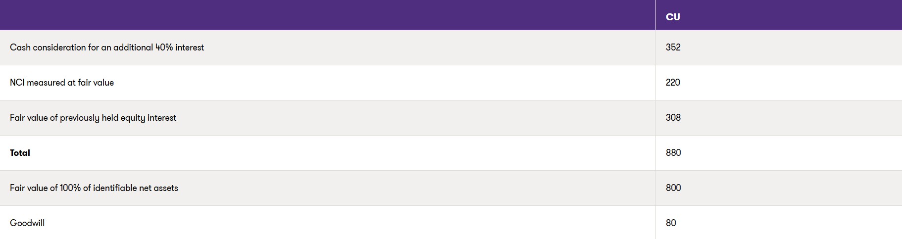 On 31 December 20X4, Entity A purchased an additional 40% interest in Entity B in cash for CU352, thereby obtaining control with a 75% interest in Entity B. Entity A opted to measure NCI at fair value, which was determined to be CU220.