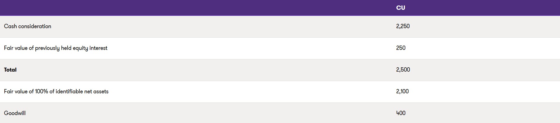 The fair value of the identifiable net assets of Entity Y at the acquisition date was CU2,100.