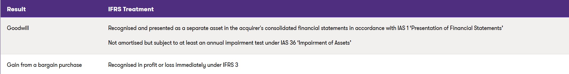 Applying IFRS 3's formula may result in a positive amount (goodwill) or a negative amount (gain from a bargain purchase). These amounts are accounted for differently and disclosure requirements are also different.